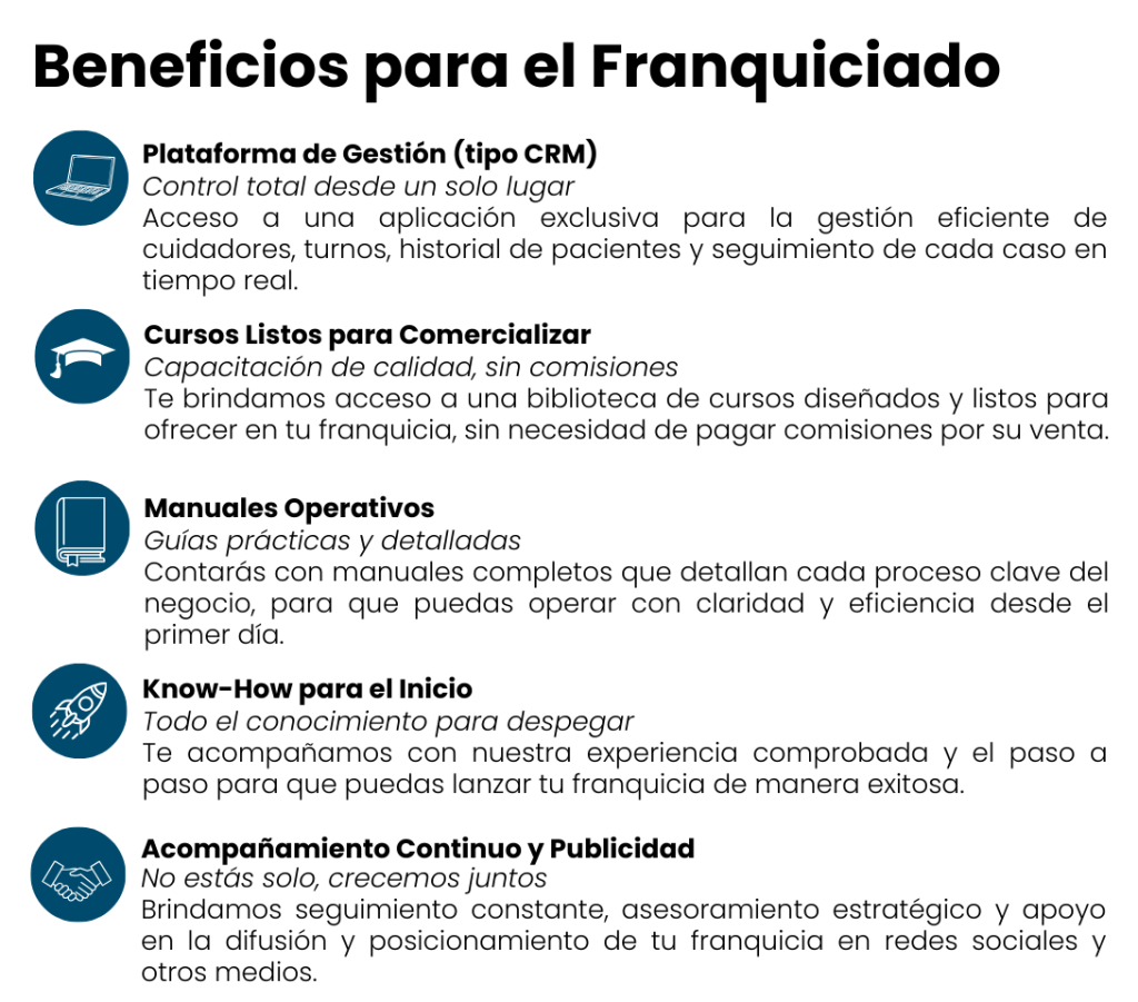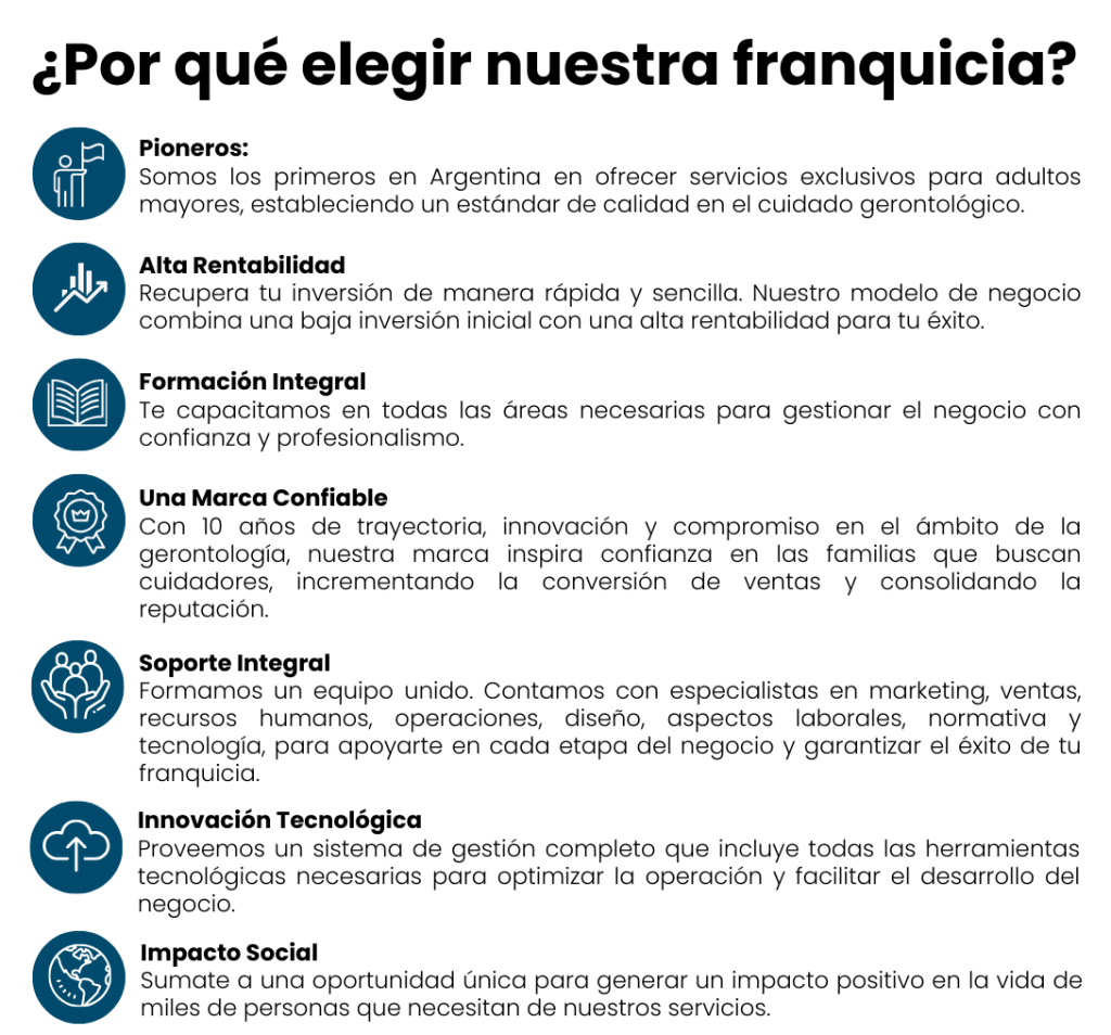 Te ofrecemos la asesoria necesaria para que puedas iniciarte en la prestación de salud para adultos mayores. Como franquiciado, podrás contar con un modelo de negocio probado y rentable, respaldado por nuestra experiencia y trayectoria en el mercado. Si estás buscando emprender en un sector en crecimiento y contribuir al bienestar de los adultos mayores, contáctanos para conocer más sobre esta emocionante oportunidad de franquicia. ¡Juntos podemos marcar la diferencia en la vida de las personas mayores!